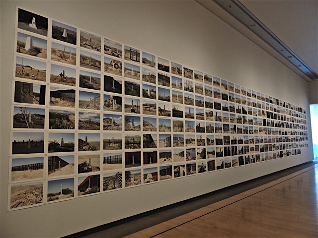 I went to the Phoenix Art Museum last week to see an exhibit of photos by David Taylor. Between 2007 and 2015, Taylor worked on a project to photograph all 276 of the obelisks that mark the border between the United States and Mexico. Working between El Paso Texas/Juarez Mexico (where the border leaves the Rio Grande river and moves across land to the Pacific Ocean at San Diego California/Tijuana Mexico. The obelisks were put in place during the 1890's by the International Boundary Commission and they were documented then by photographer D. R. Payne. In 2015, Taylor published a book with pictures of each obelisk in numerical order and this exhibit also includes all 276 photos along the wall above. It was fascinating to see how the terrain changes and how some obelisks are now surrounded by border walls and fences while others in rougher terrain are still wide open.